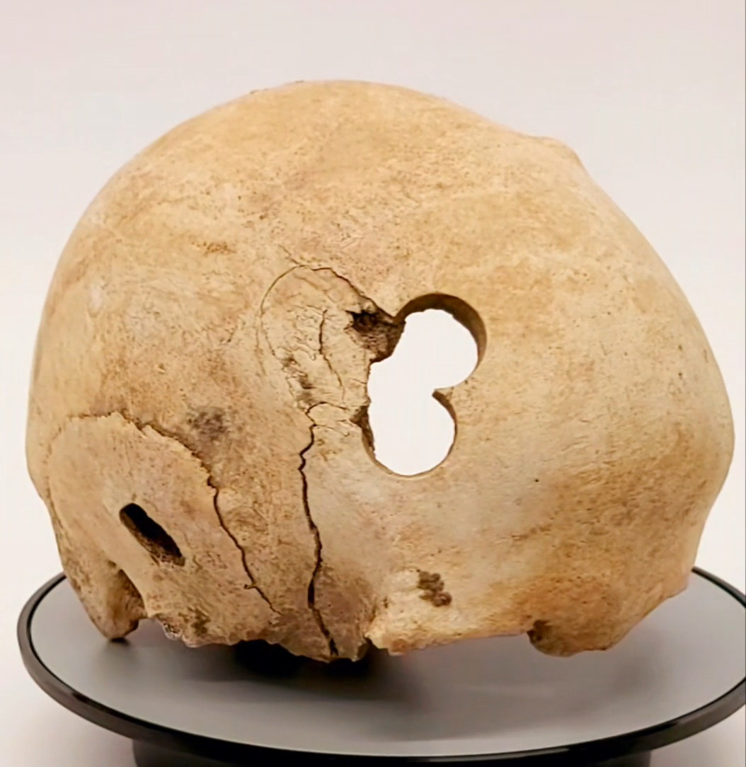Die Bilder zeigen eine Schädeltrepanation im Bereich des Os parietale und des Os laterale. Es sind die glatten Ränder zweier Schädeleingriffe, die mit einer Bohrkrone ausgeführt wurden. War die Verletzung vielleicht ein Schlag auf den Schädel? Da die Bohrränder keine Kallusbildung aufweisen, ist davon auszugehen, dass der Verletzte den Eingriff nicht überlebte, oder dass dies ein postmortaler Eingriff war.
